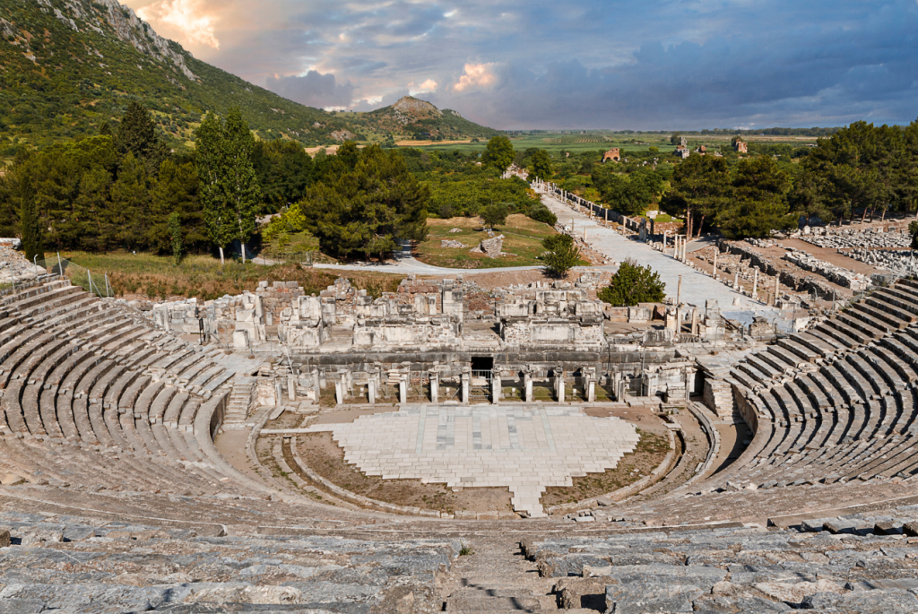 The Great Theatre in the Ephesus Ancient City is one of the largest and most impressive theaters of the ancient era. Situated in the heart of the city along Curetes Street, this theater, one of Ephesus’s most important structures, can accommodate a large audience of approximately 24,000 to 25,000 people.