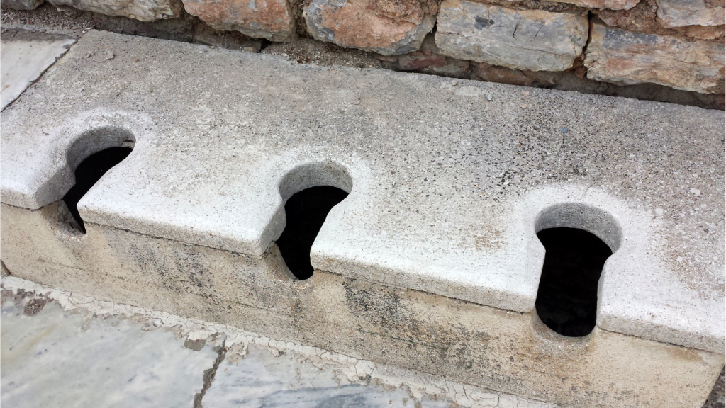 Public toilets were typically located in the main streets and squares of the city. The designers planned these toilets to serve a wide population, often siting them outdoors or within simple structures and arranging the toilets on one or more rows of stone or marble seats.